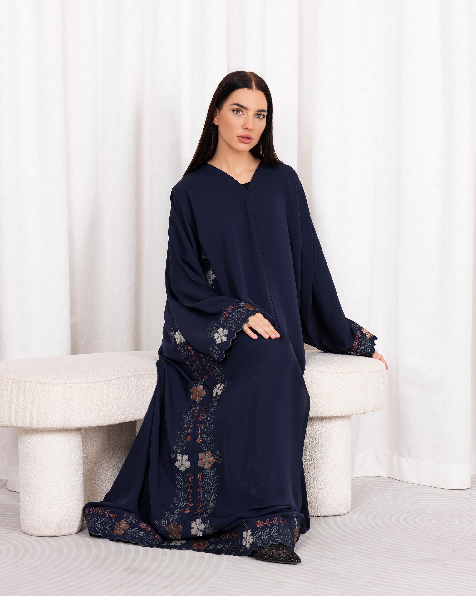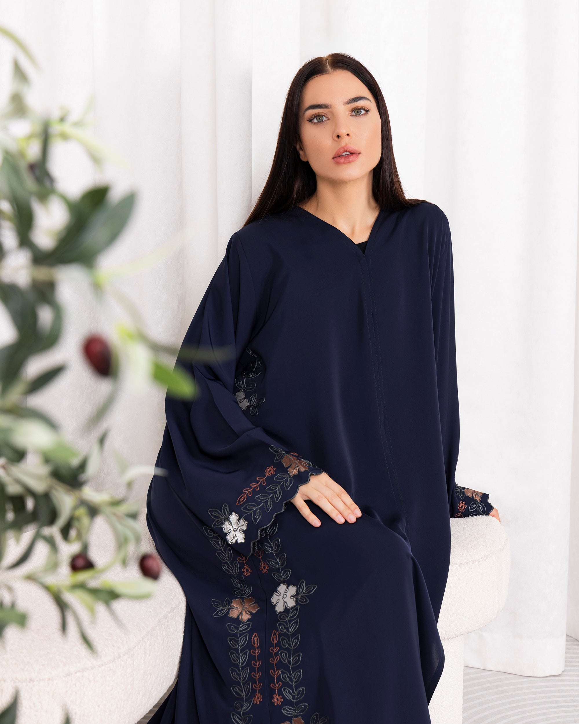 ZARA BLUE features a Blue Nada abaya adorned with delicate flower embroidery, blending graceful design with timeless elegance.