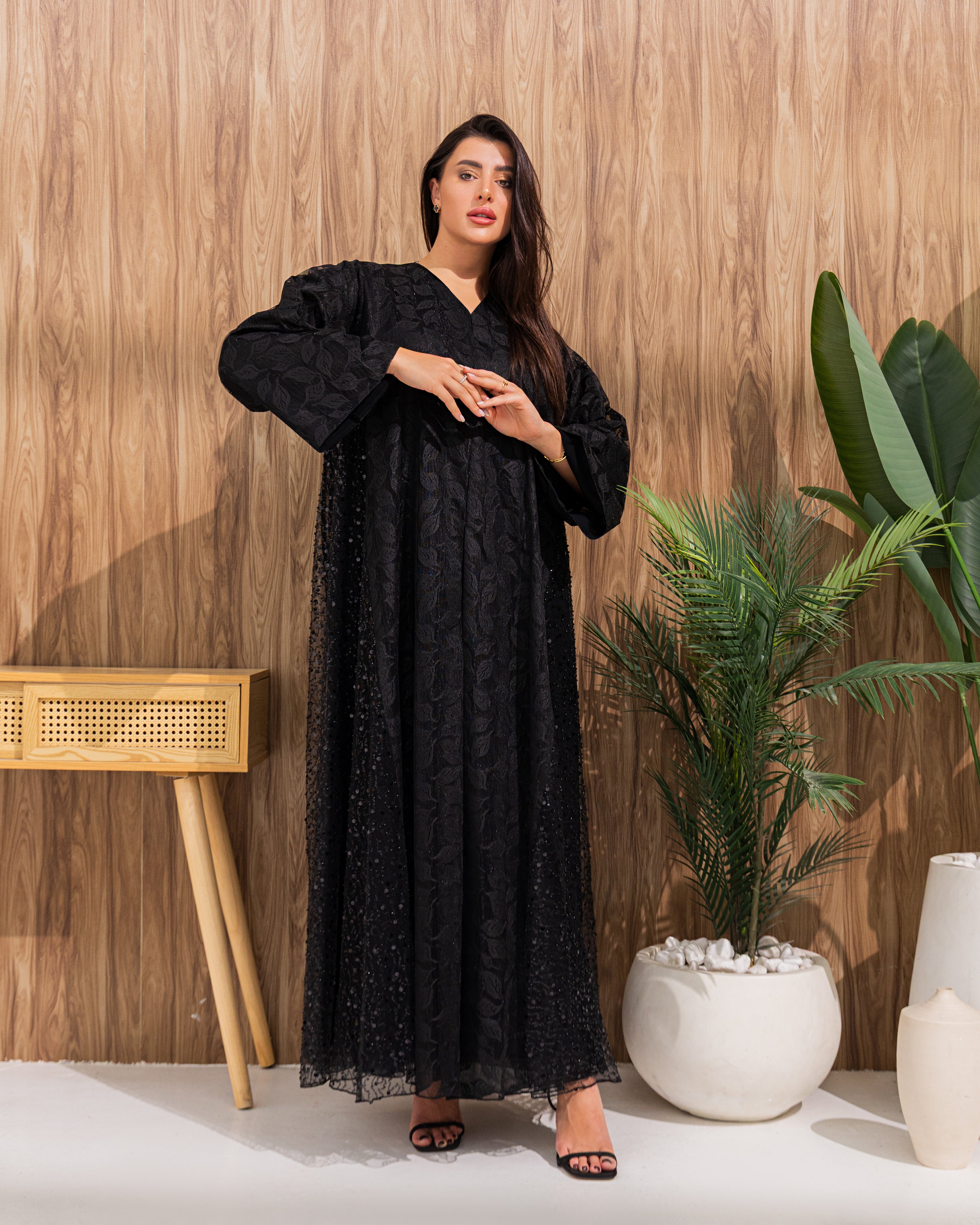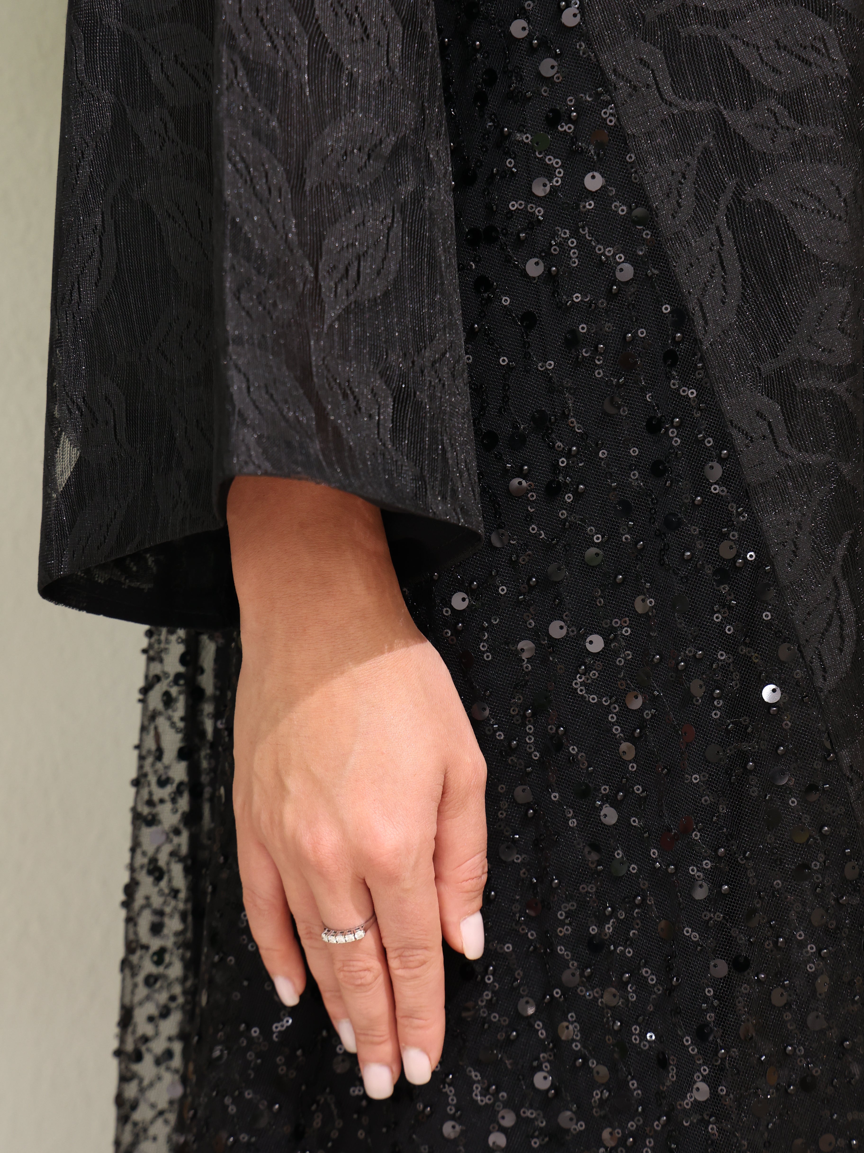 Crafted from premium jacquard fabric with a sheer mesh overlay, this abaya offers a rich texture and elegant drape that feels as luxurious as it looks.