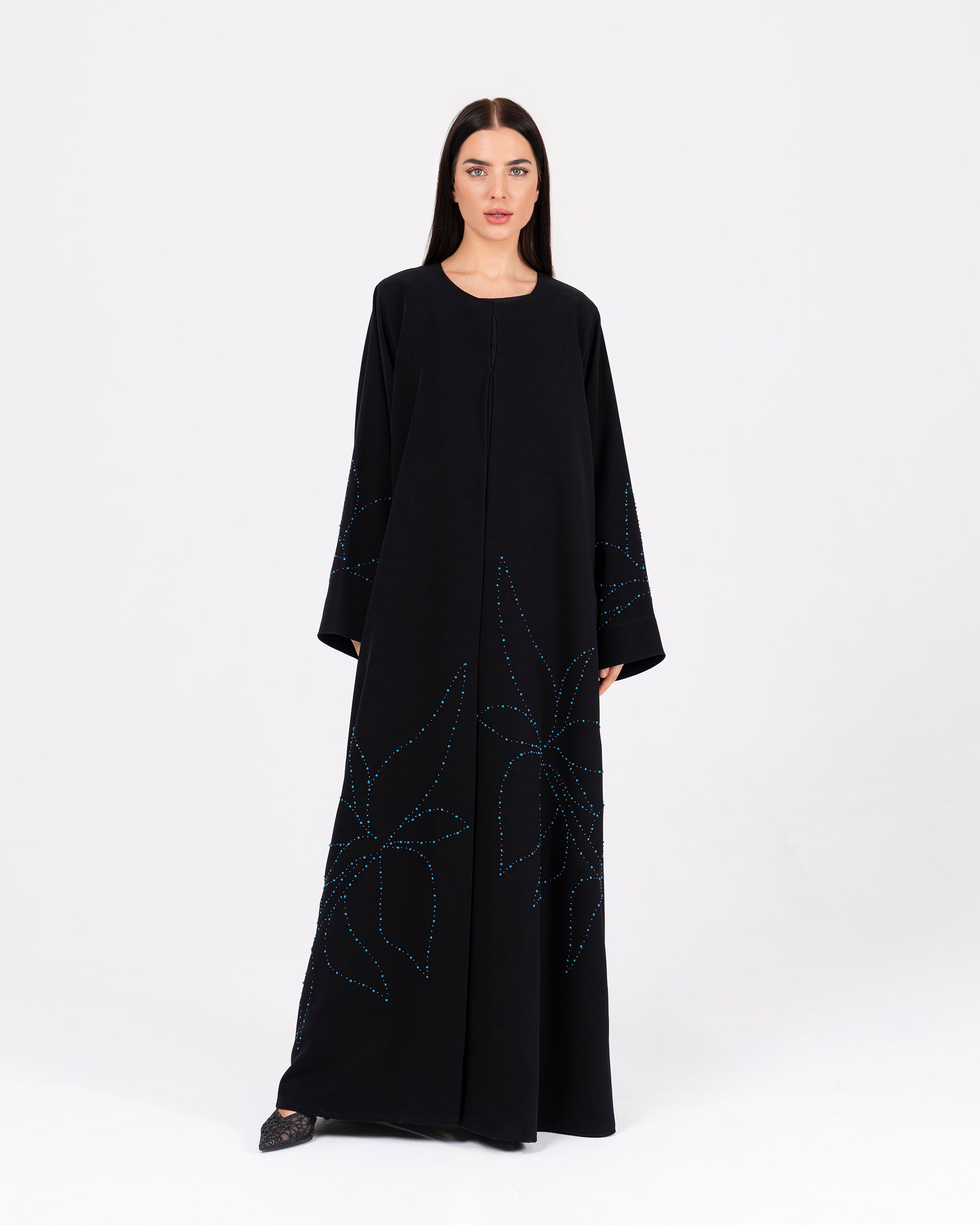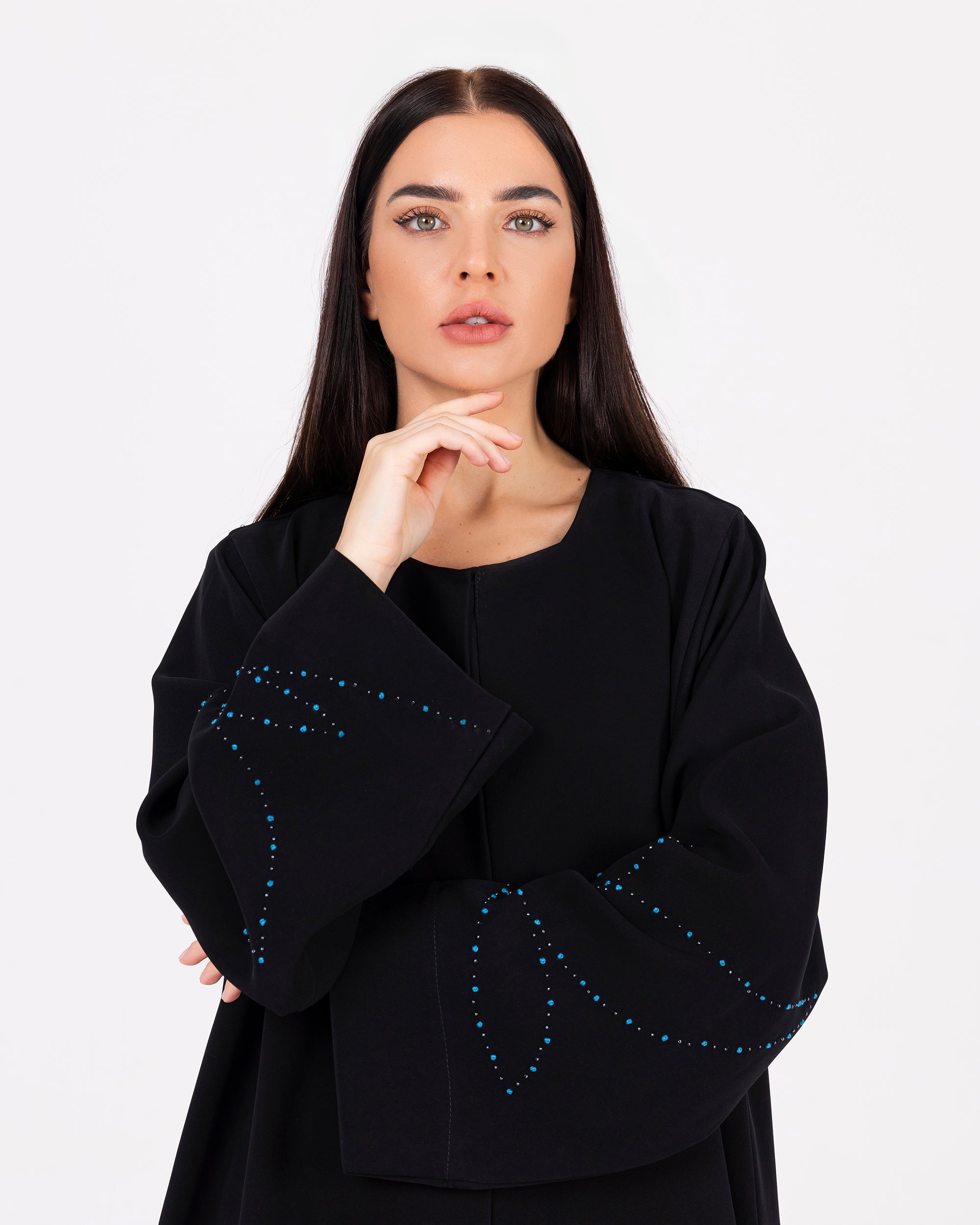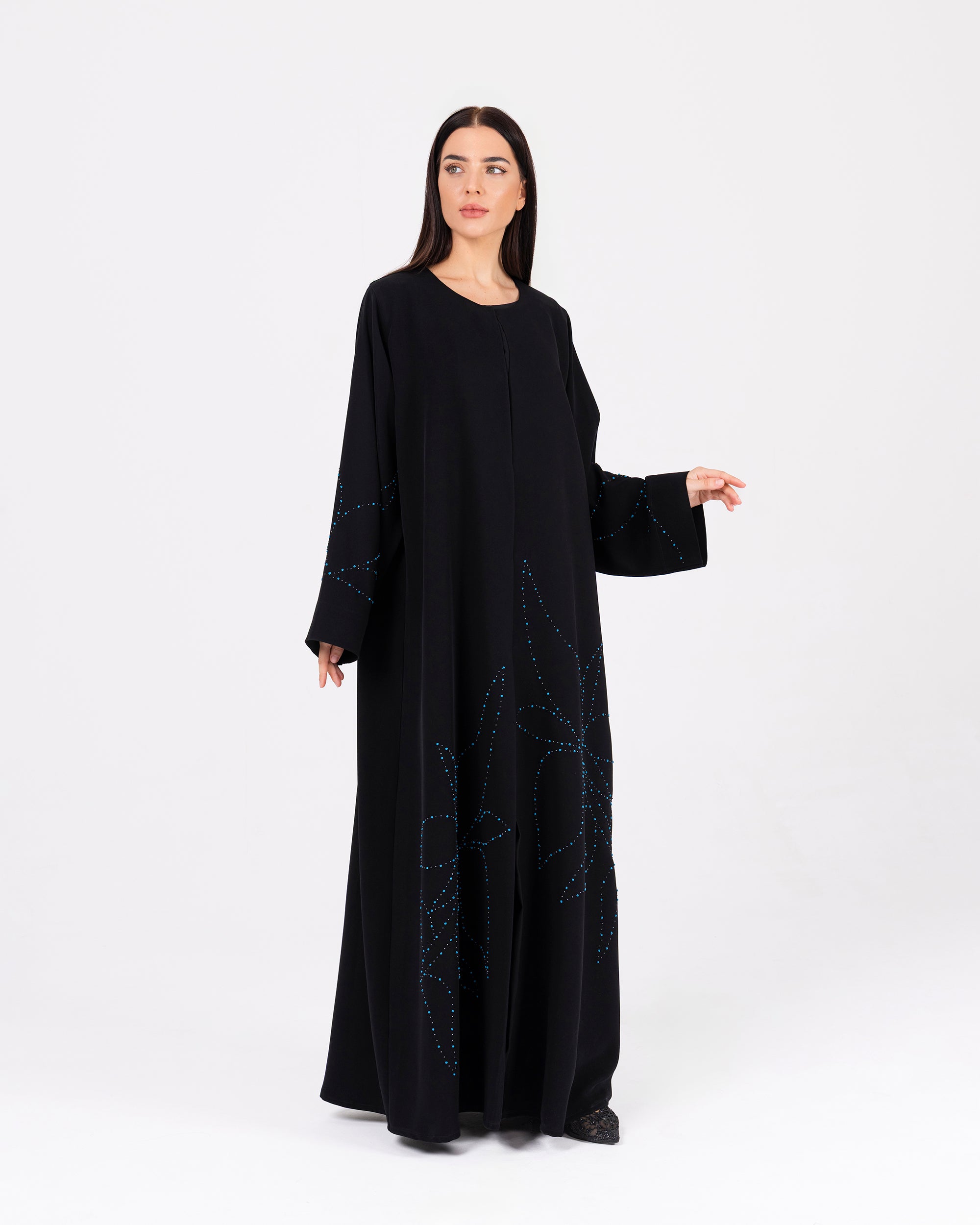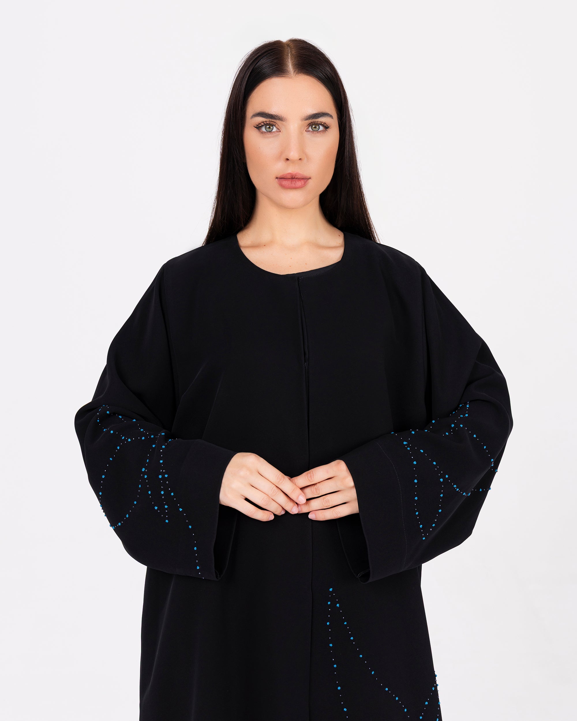 The RIYA BLACK abaya features elegant blue thread embellishments that add a subtle yet striking detail to its classic black fabric. Perfect for a refined and graceful look.