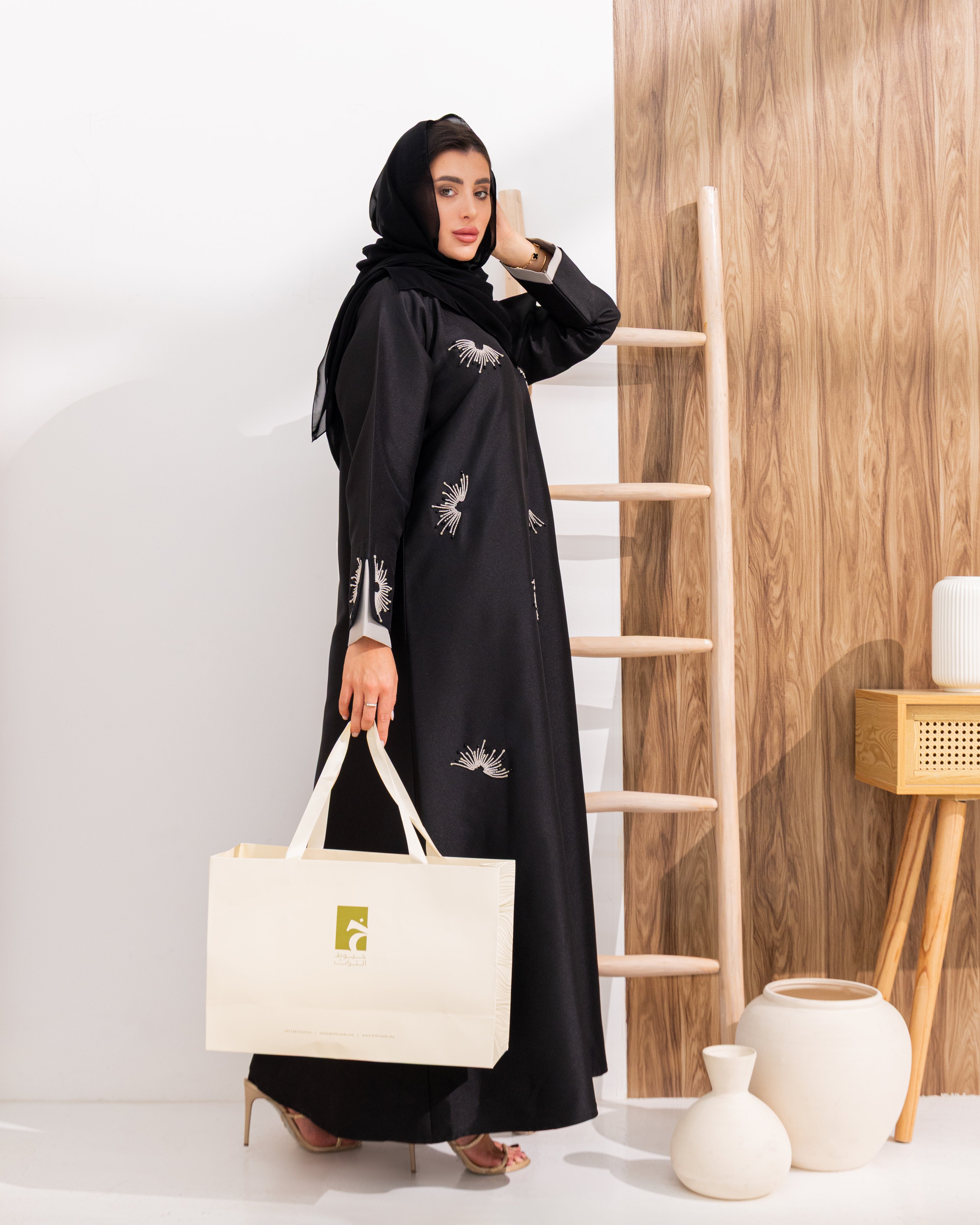 Its black color is a timeless staple, and the minimal, celestial hand beadwork provides a subtle, unique detail, appealing to a modern preference for sophisticated, high-quality, individualized modest wear.