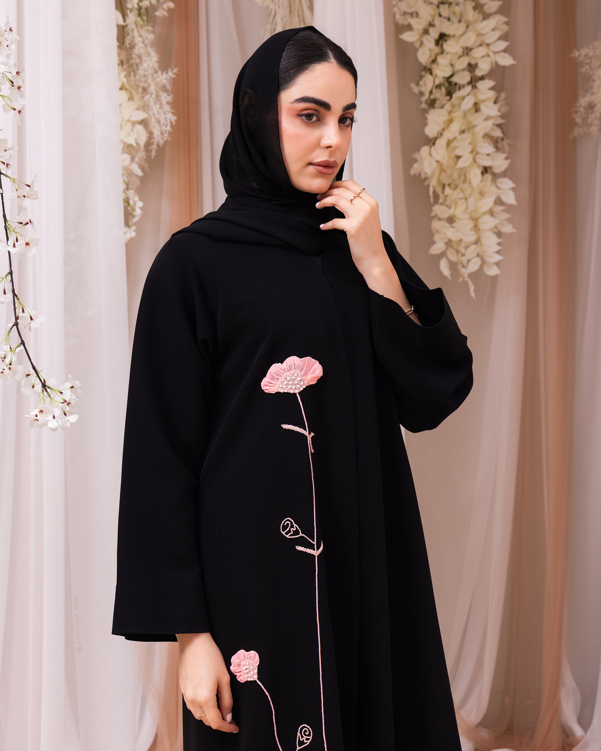 Korea Jet Black Barbie Abaya crafted from premium Korean Barbie fabric with a soft, elegant drape. Delicate pink floral embellishments add a romantic touch to the classic black design.