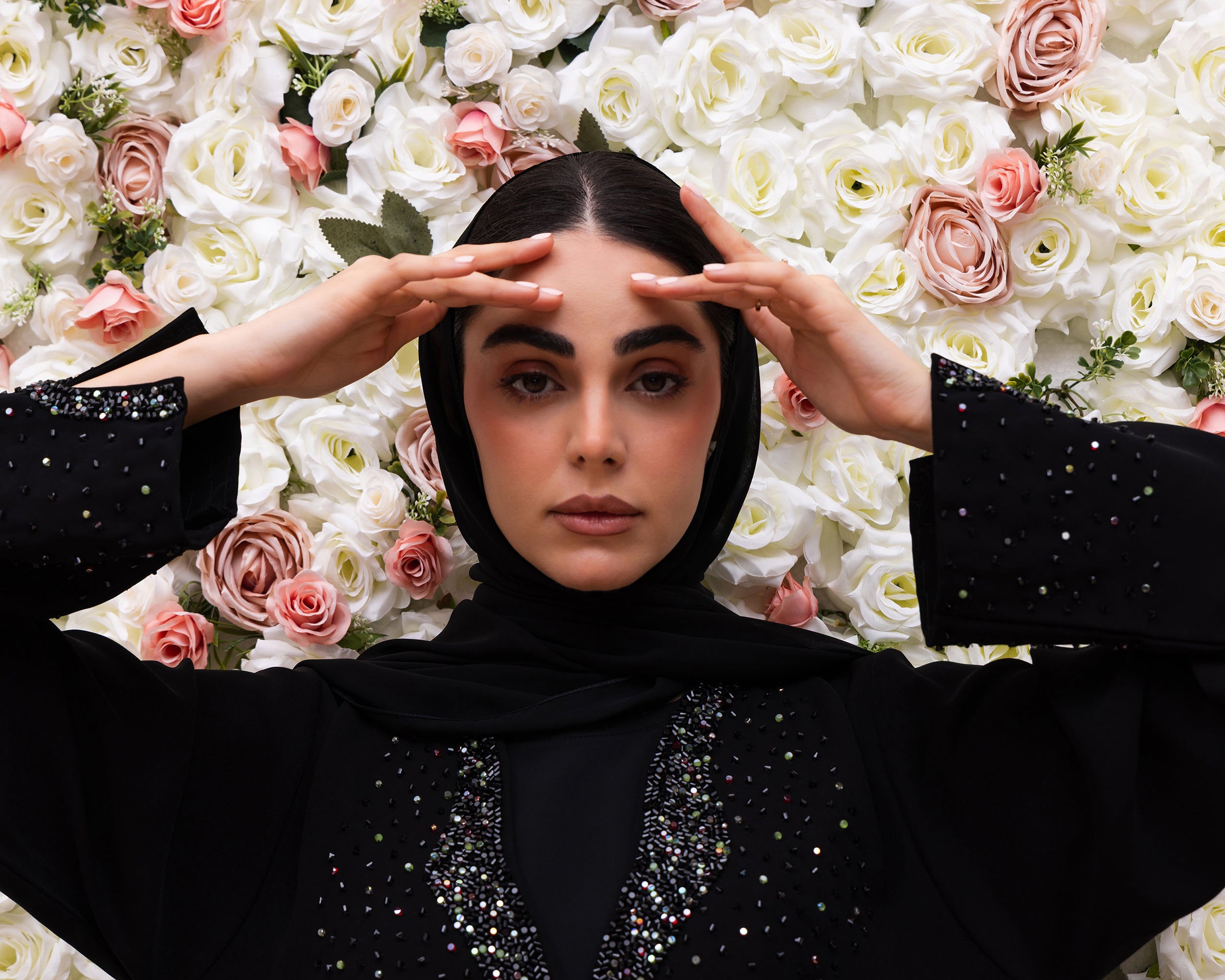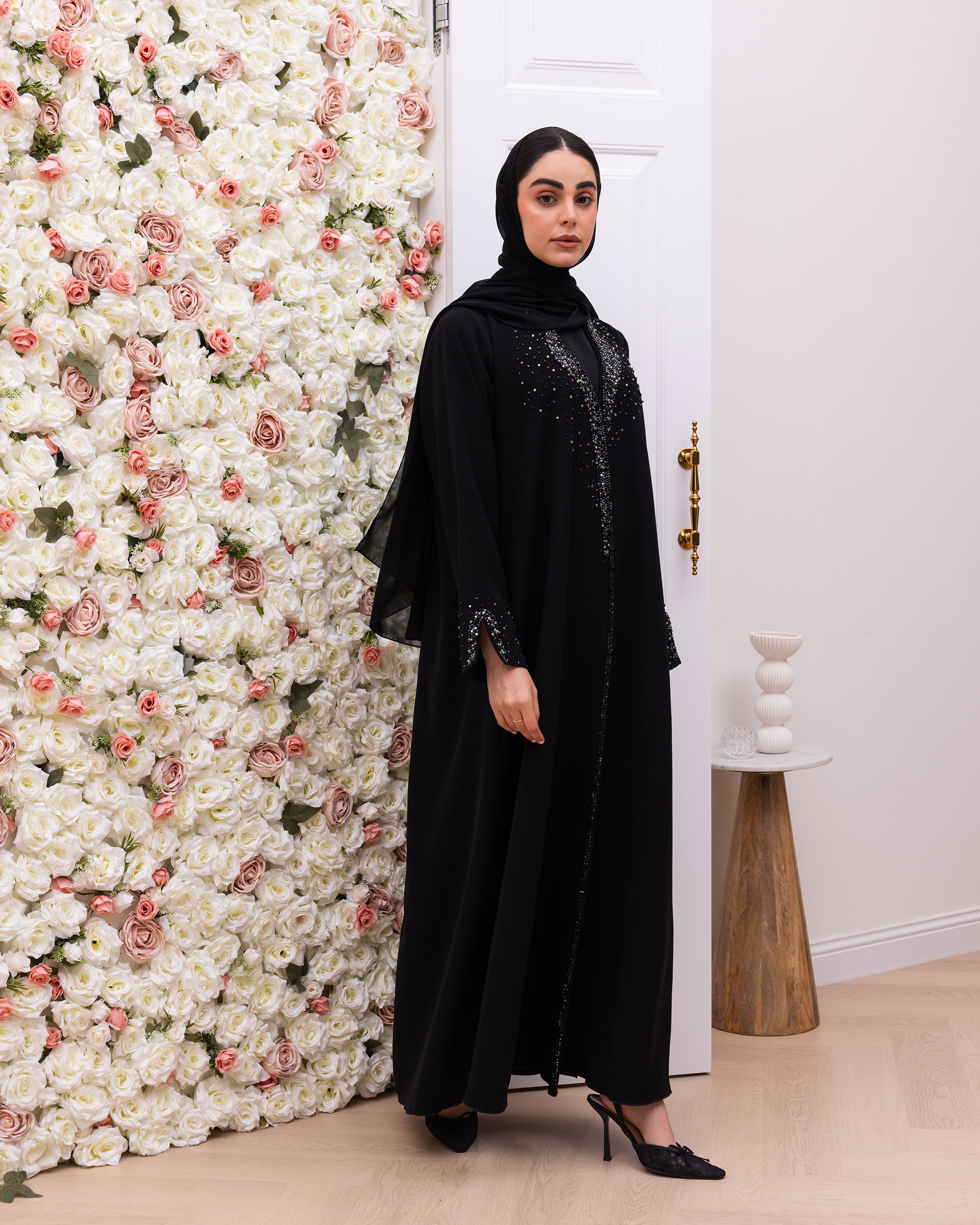 Indonesia Jet Black Barbie Abaya made from premium Indonesian Barbie fabric for comfortable wear. Featuring vibrant colored beadwork on the front, adding a stylish and eye-catching touch to a classic modest look.