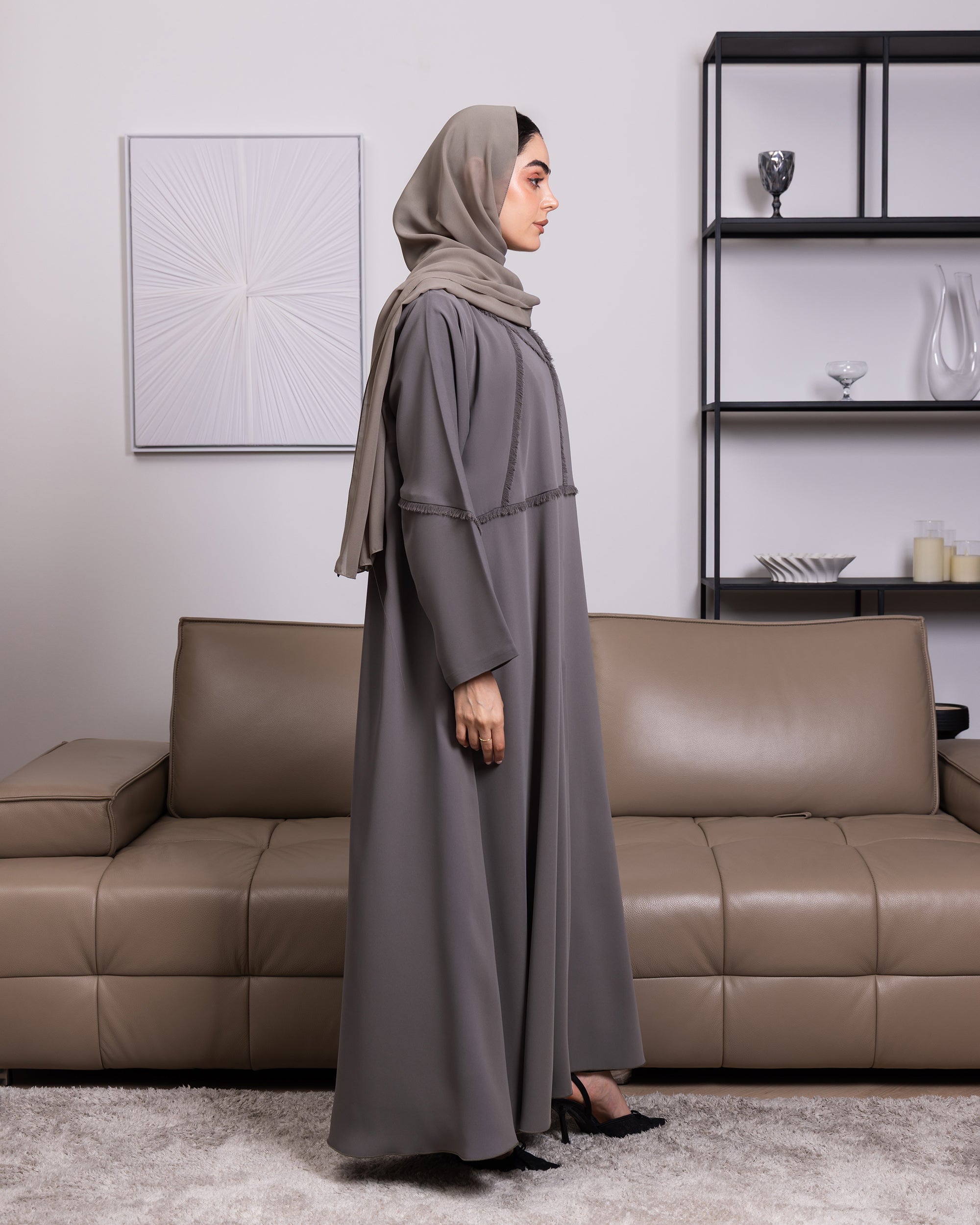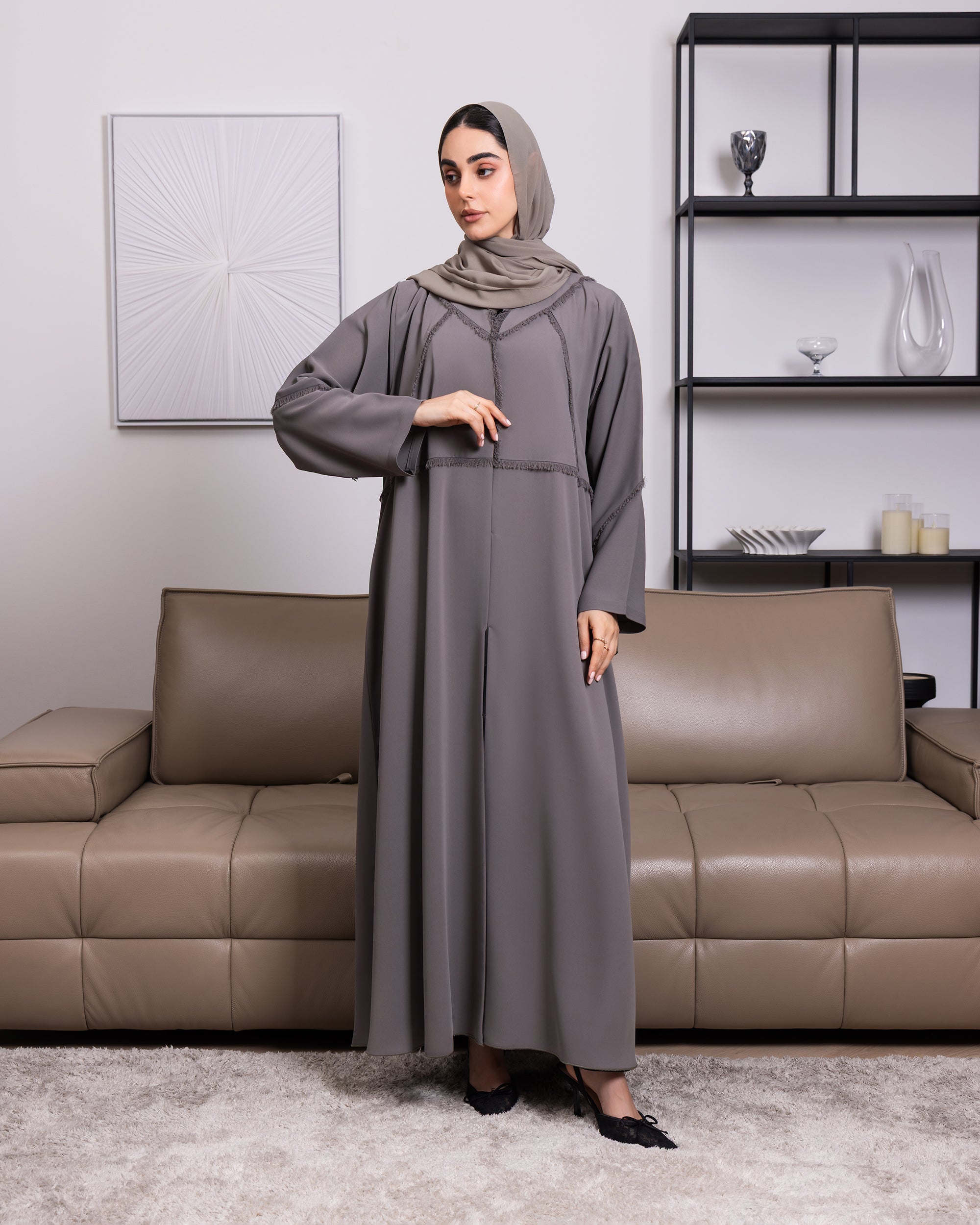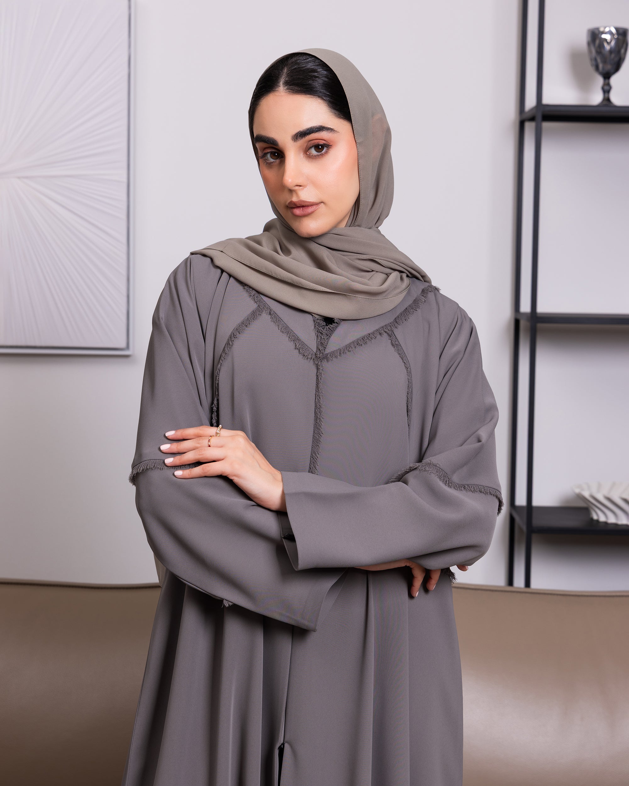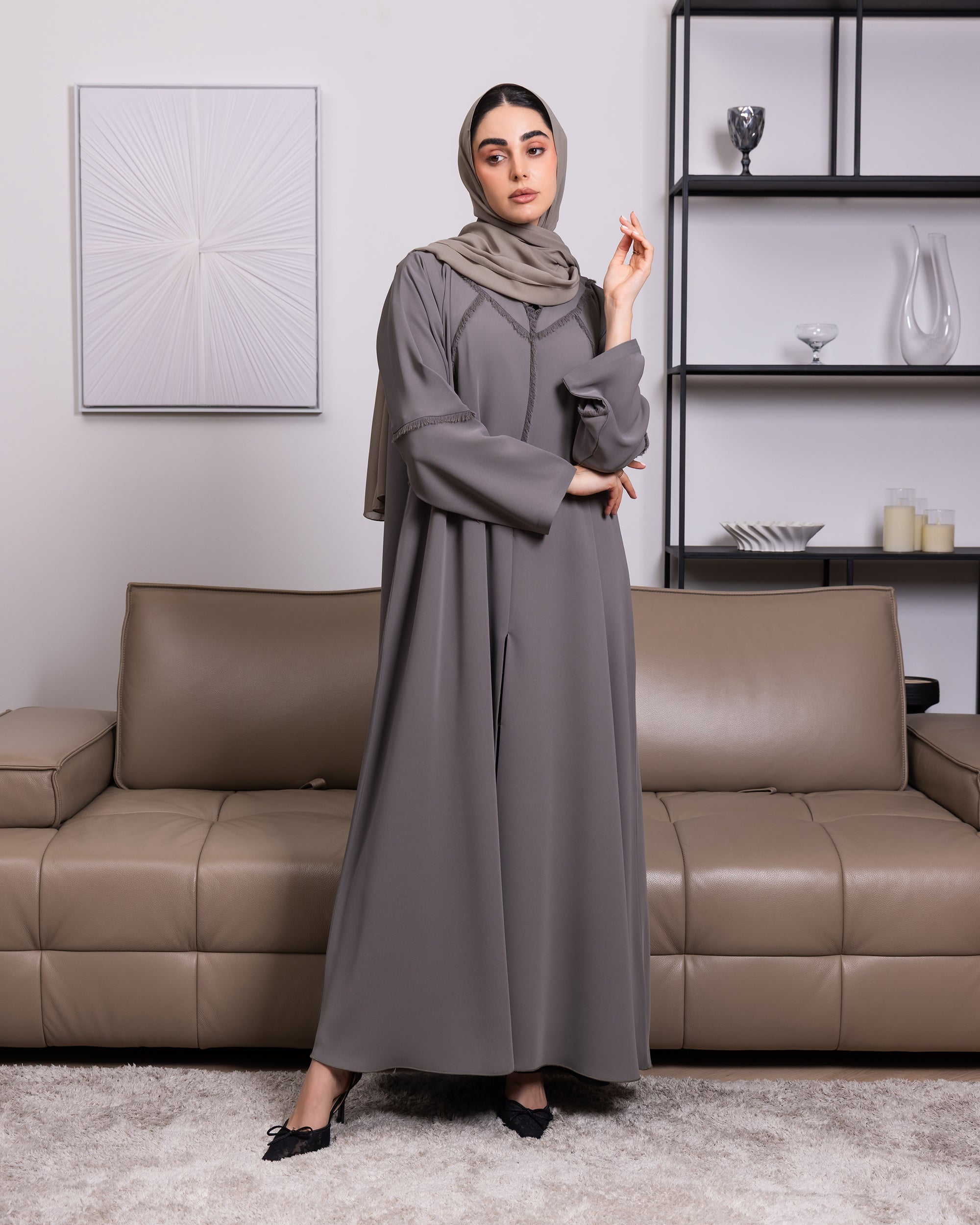 Classic A-line flowing silhouette with a relaxed fit and full floor-length coverage. Designed with long sleeves, a Jetour finish, and a front-open style for complete modest coverage.